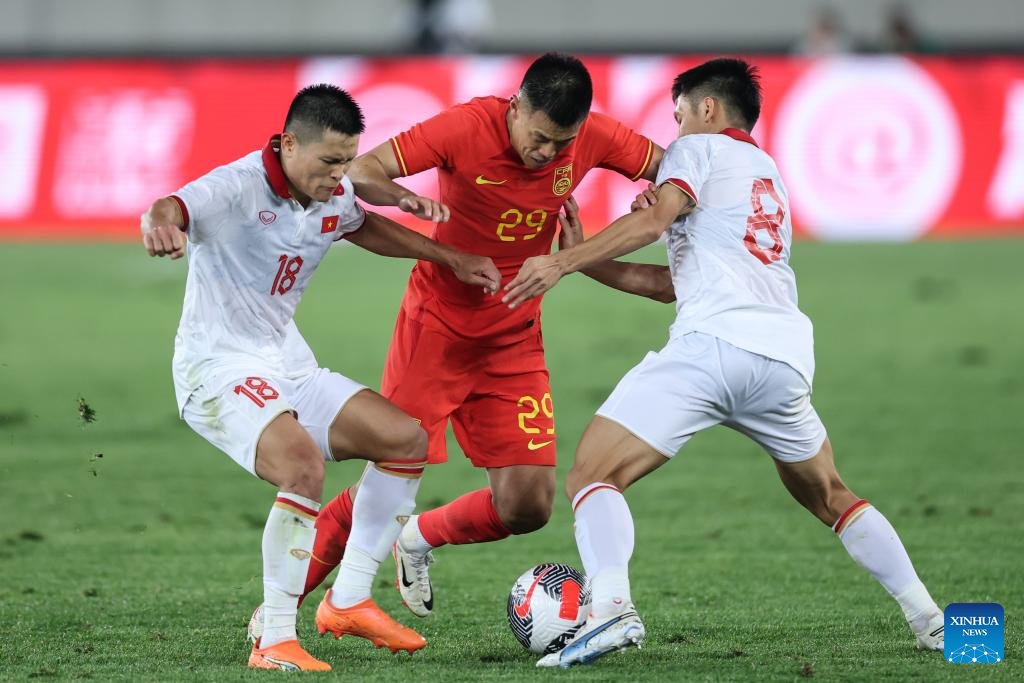 Tan Long (C) of China tries to break through during an international friendly football match between China and Vietnam in Dalian, northeast China's Liaoning Province, Oct. 10, 2023. (Xinhua/Pan Yulong)