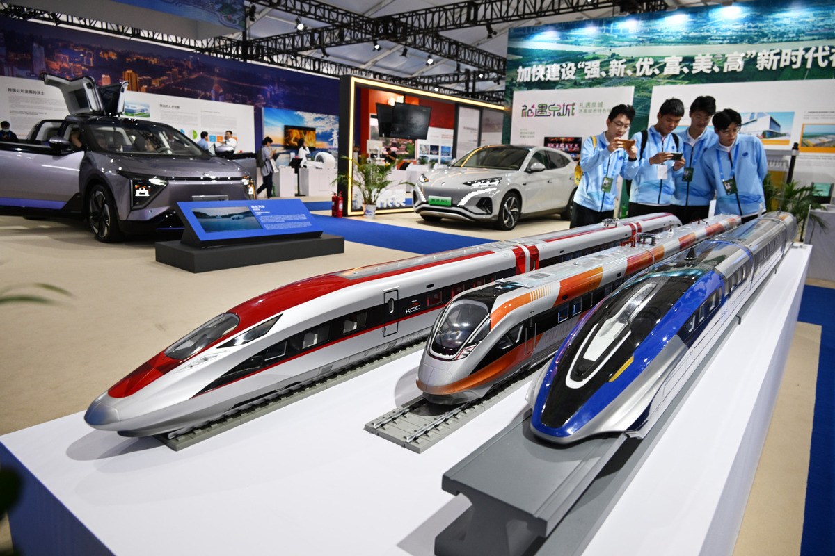 Visitors take pictures of high-speed rail models at the 2023 Multinationals in China Exhibition in Qingdao, Shandong province, Oct 10, 2023. [Photo/Xinhua]