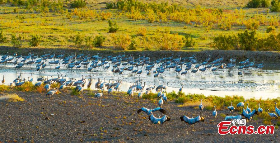 A flock of gray cranes forage at Ebinur Lake wetland natural reserve in Bortala Mongol Autonomous Prefecture, northwest China’s Xinjiang Uyghur Autonomous Region. (Photo: China News Service/Qin Guilian)