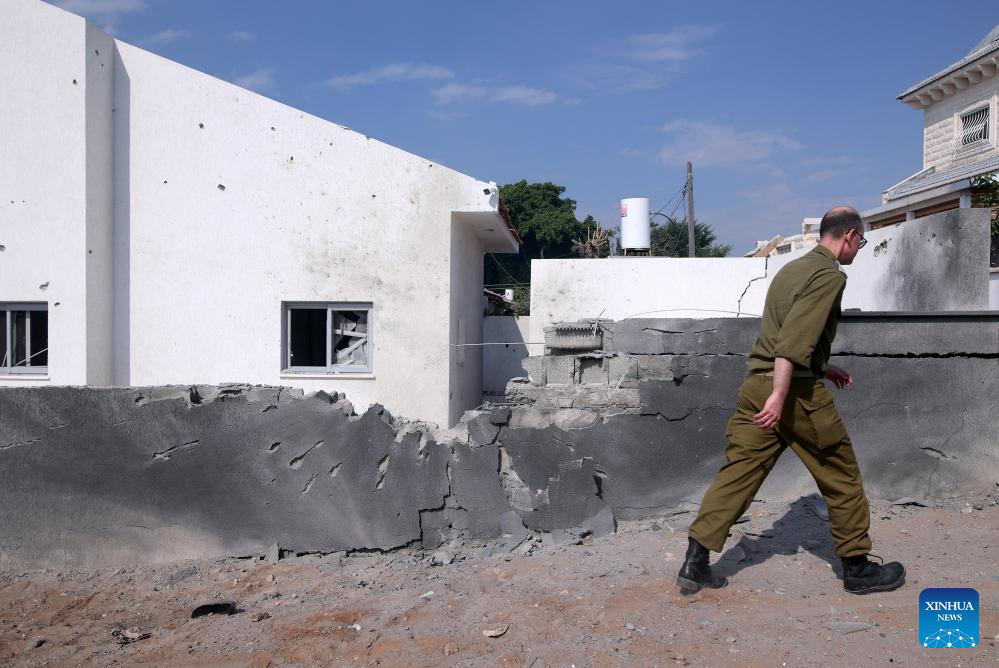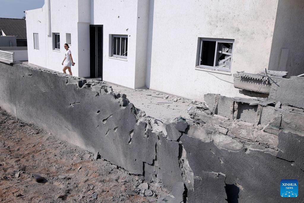 Photo taken on Oct. 11, 2023 shows a wall damaged in rocket attacks from Gaza, in Ashkelon, Israel. (Ilan Assayag/JINI via Xinhua)