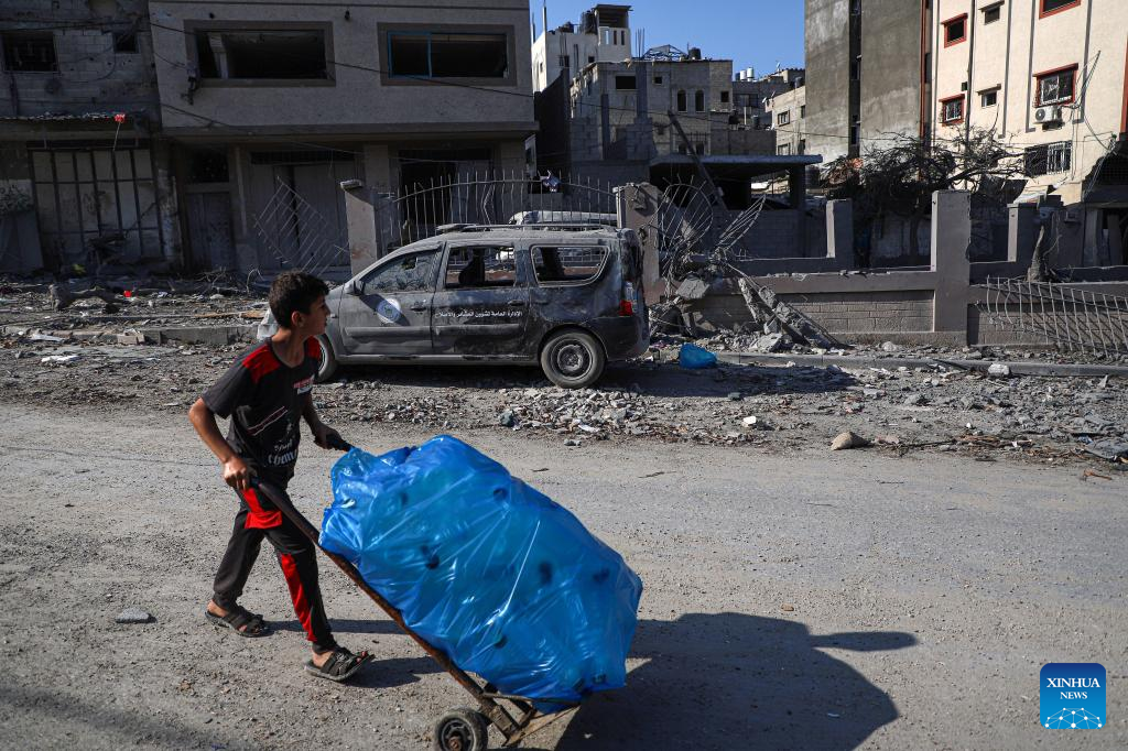 A boy pushes a cart as he walks past buildings destroyed in Israeli airstrikes in Gaza City, on Oct. 11, 2023. (Photo by Rizek Abdeljawad/Xinhua)
