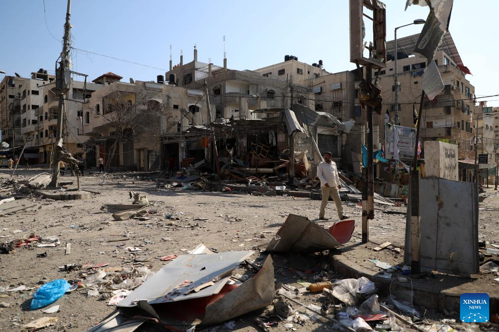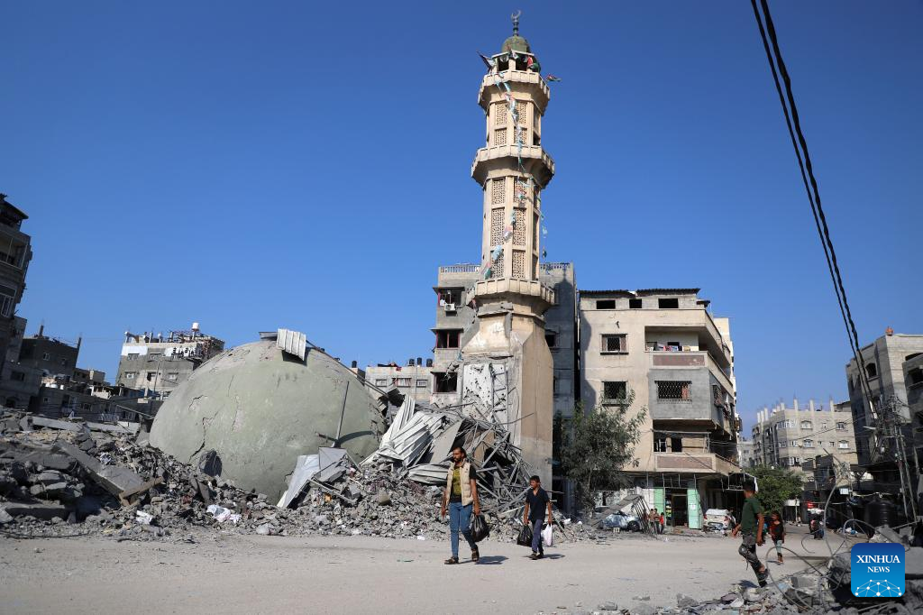 Palestinians walk past buildings destroyed in Israeli airstrikes in Gaza City, on Oct. 11, 2023. (Photo by Rizek Abdeljawad/Xinhua)