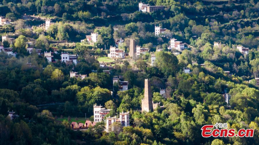 A beautiful scene of traditional Tibetan houses on green mountain under the blue sky in Zhonglu Village of Danba County, Ganzi Tibetan Autonomous Prefecture, southwest China’s Sichuan Province, Oct. 10, 2023. (Photo: China News Service/Sun Zhongnan)