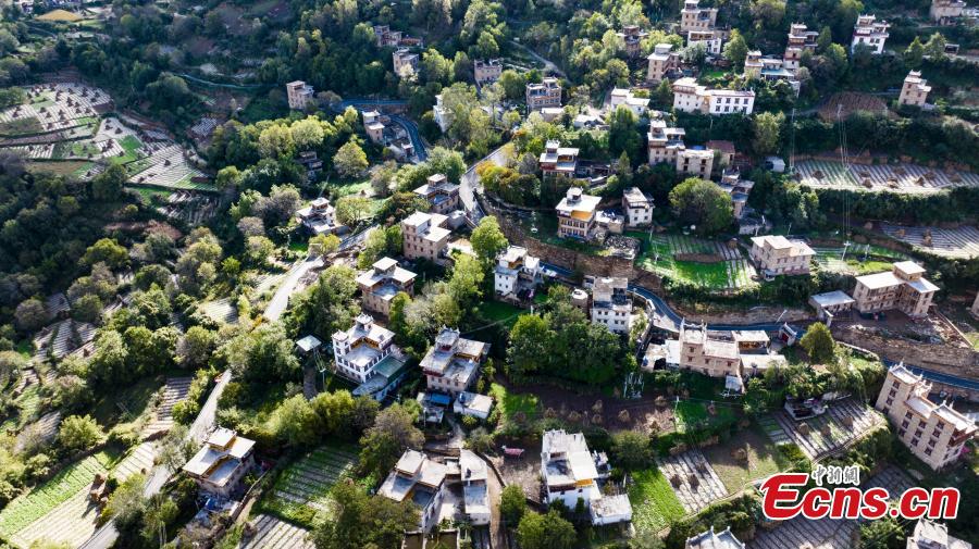 A beautiful scene of traditional Tibetan houses on green mountain under the blue sky in Zhonglu Village of Danba County, Ganzi Tibetan Autonomous Prefecture, southwest China’s Sichuan Province, Oct. 10, 2023. (Photo: China News Service/Sun Zhongnan)