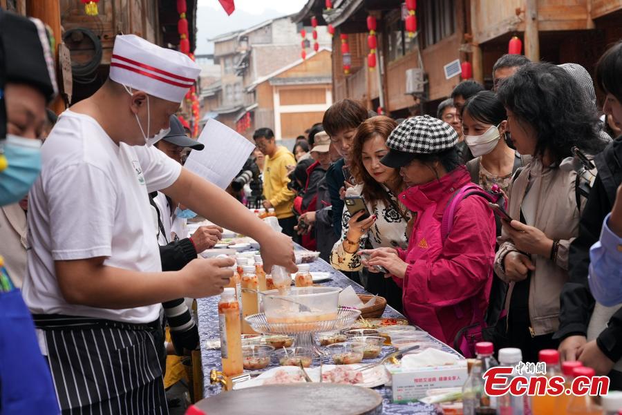Villagers participate in a raw fish serving contest during a folk festival to celebrate harvest in Longsheng County of Guilin, south China's Guangxi Zhuang Autonomous Region, Oct. 10, 2023. (Photo: China News Service/Wei Jiyang)