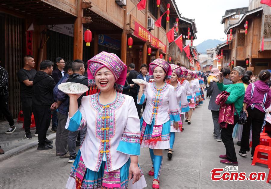 Villagers serve fish feast during a folk festival to celebrate harvest in Longsheng County of Guilin, south China's Guangxi Zhuang Autonomous Region, Oct. 10, 2023. (Photo: China News Service/Wei Jiyang)