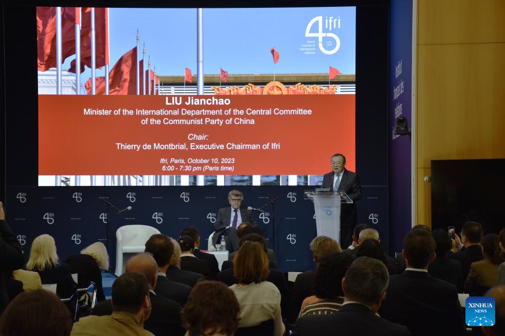 Liu Jianchao, head of the International Department of the Communist Party of China (CPC) Central Committee, delivers a speech at the French Institute of International Relations in Paris, France, Oct. 10, 2023. Liu Jianchao led a CPC delegation on a visit to France from Oct. 8 to 11. (Xinhua/Qiao Benxiao)