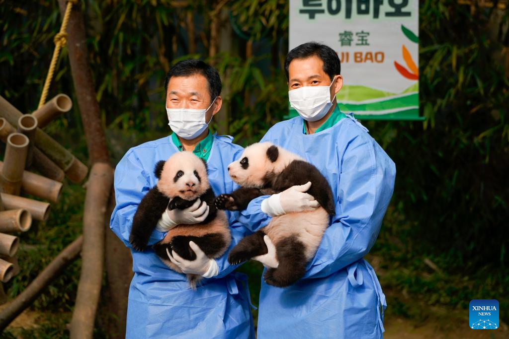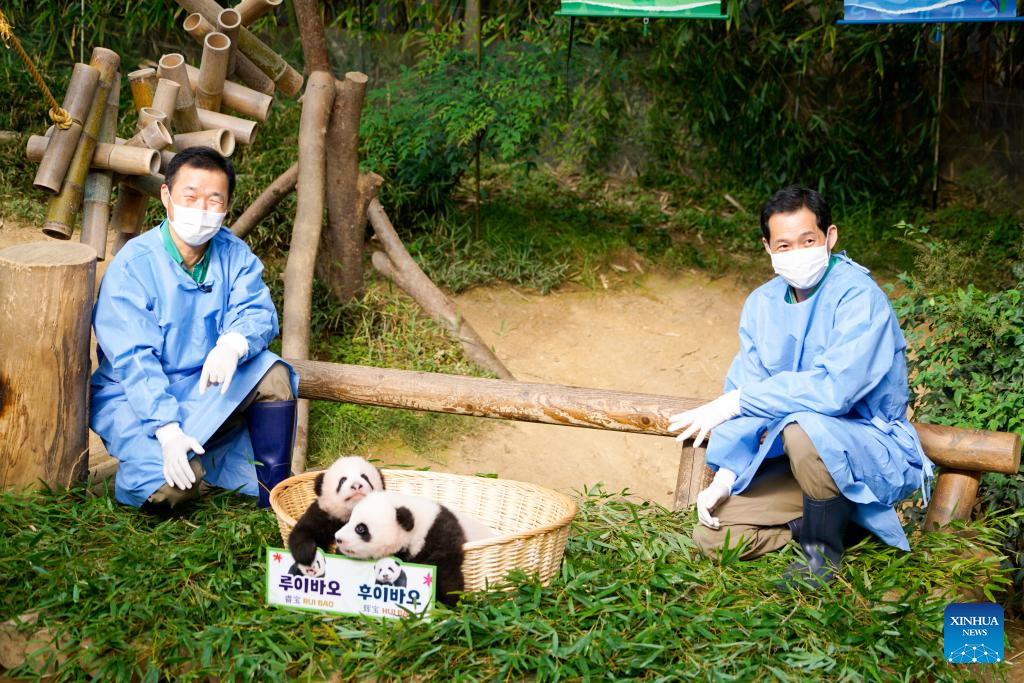 Giant panda twins meet public and revealed names in Yongin, S. Korea