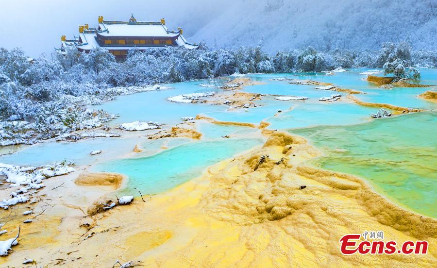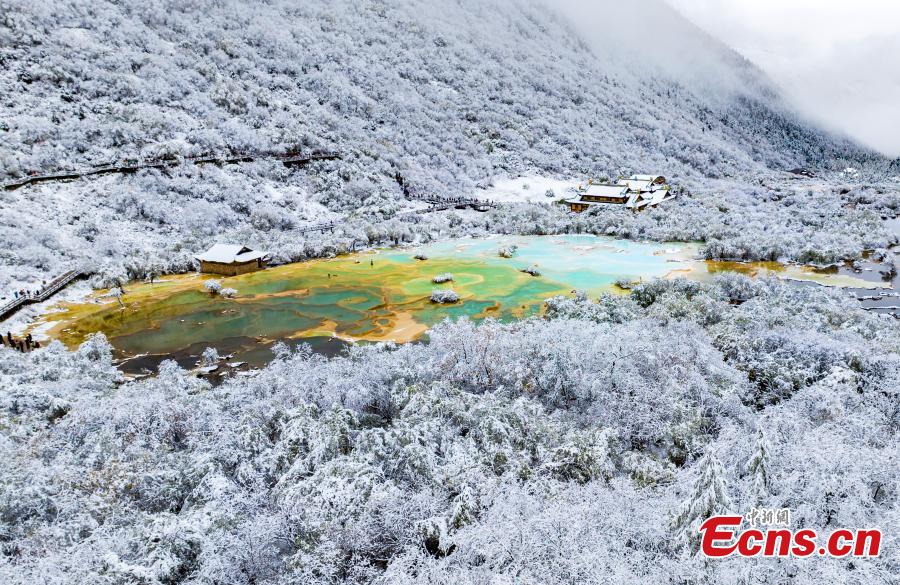 Beautiful ponds and surrounding mountains are blanketed with snow, resembling a charming wonderland at Huanglong Scenic and Historic Interest Area in Songpan County, southwest China's Sichuan Province, Oct. 12, 2023. Famous for its colorful water pools, snow mountains, deep valleys and forests, Huanglong was listed as one of UNESCO world heritage sites in 1992. (Photo: China News Service/Jiang Yuebin)