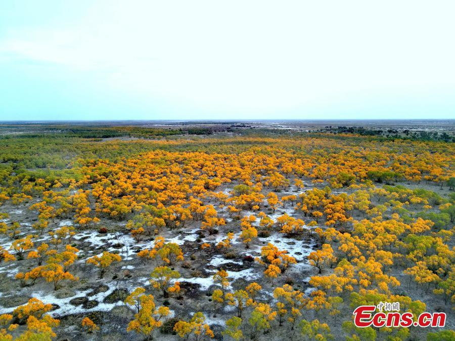 Autumn is the best season to visit the populus euphratica forest in Wensu County, Aksu Prefecture, Northwest China's Xinjiang Uyghur Autonomous Region as it becomes a sea of golden leaves. (Photo: China News Service/Zhao Xinchang)