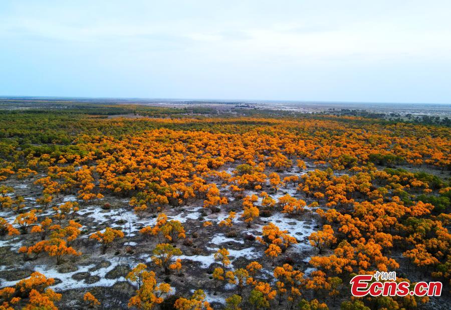 Autumn is the best season to visit the populus euphratica forest in Wensu County, Aksu Prefecture, Northwest China's Xinjiang Uyghur Autonomous Region as it becomes a sea of golden leaves. (Photo: China News Service/Zhao Xinchang)