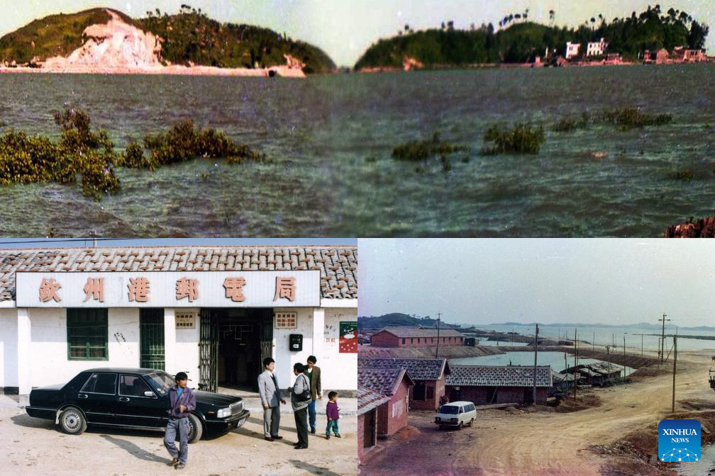 This combo file photo shows the fishing village, where Qinzhou Port locates, before construction in the 1990s in Qinzhou, south China's Guangxi Zhuang Autonomous Region. (Xinhua)