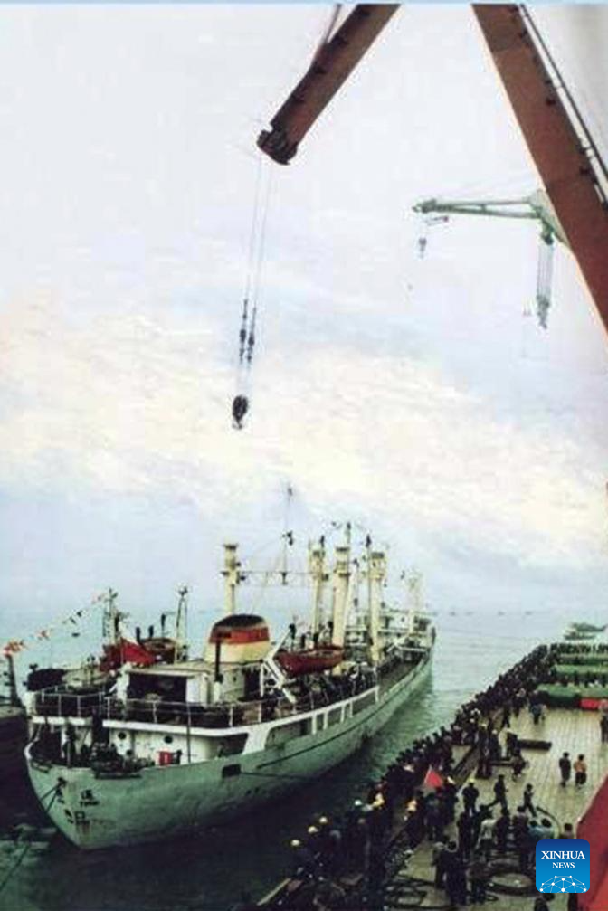 This file photo taken on Jan. 16, 1994 shows the first container vessel arriving and unloading at the Qinzhou Port in Qinzhou, south China's Guangxi Zhuang Autonomous Region. (Xinhua)