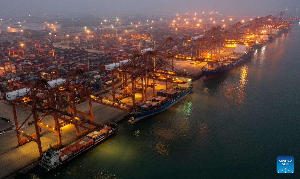This aerial photo taken on March 24, 2021 shows container vessels unloading at night at the Qinzhou Port in Qinzhou, south China's Guangxi Zhuang Autonomous Region. (Xinhua/Zhang Ailin)