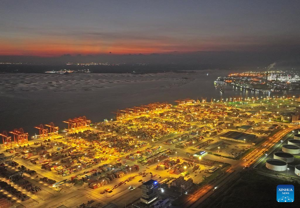 This aerial photo taken on Oct. 3, 2023 shows the night view of the Qinzhou Port in Qinzhou, south China's Guangxi Zhuang Autonomous Region. (Xinhua/Zhou Hua)