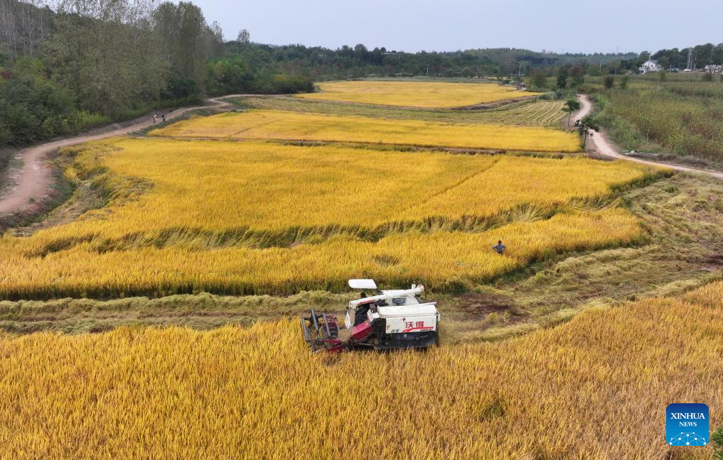 This aerial photo taken on Oct. 12, 2023 shows a farmer operating a harvester to harvest rice in Zipeng Town of Feixi County, Hefei City, east China's Anhui Province. (Xinhua/Zhou Mu)