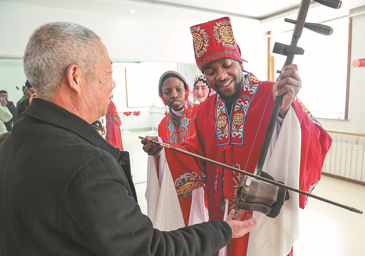 Foreign students play the traditional two-stringed Chinese instrument erhu in the Shandong city of Linyi on Feb 17. [Photo/Xinhua]