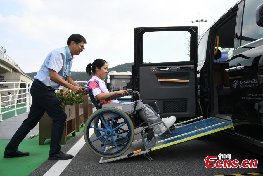 An athlete rolls her wheelchair up a ramp with the help of a staff member to get onto a bus outside Huanglong Sports Center in Hangzhou, east China's Zhejiang Province, Oct. 12, 2023. (Photo: China News Service/Wang Gang)