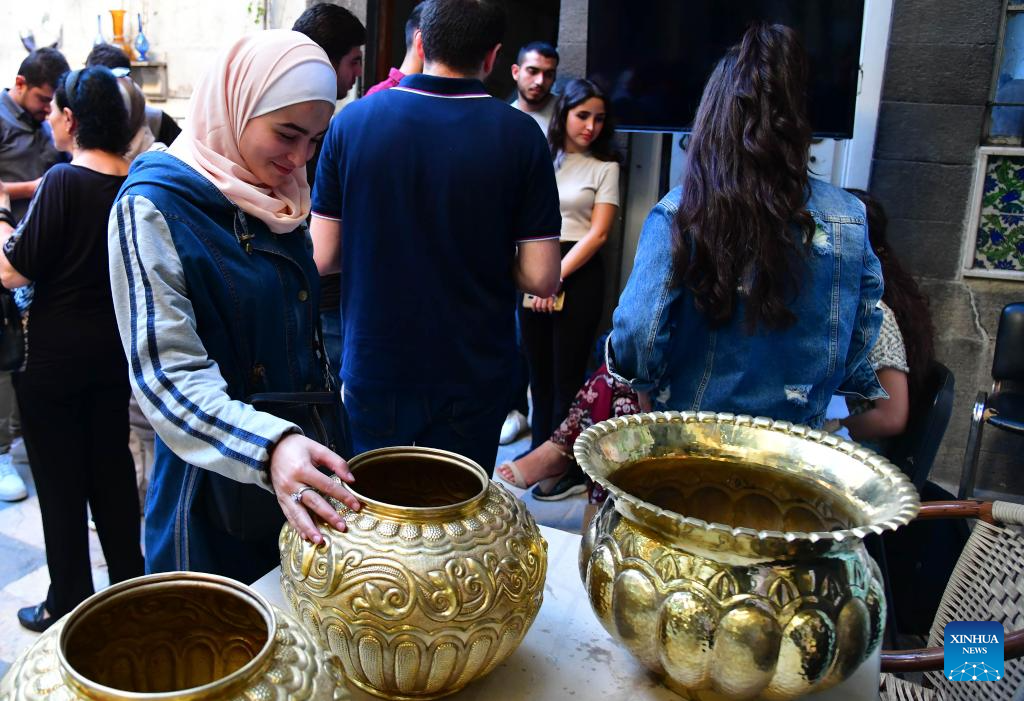 A woman touches a piece of craft work at a fair called "Craft Project" which features over 20 traditional craftsmen in old Damascus, Syria, Oct. 12, 2023. This three-day event showcases a wide range of traditional crafts, including Damascene painting, engraving, metalwork, glass art, stained glass, glass blowing, mosaic, carpets and brocade. (Photo by Ammar Safarjalani/Xinhua)