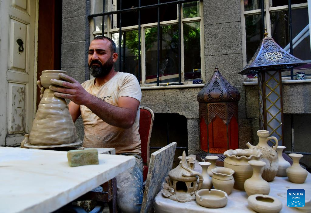A craftsman is pictured at a fair called "Craft Project" which features over 20 traditional craftsmen in old Damascus, Syria, Oct. 12, 2023. This three-day event showcases a wide range of traditional crafts, including Damascene painting, engraving, metalwork, glass art, stained glass, glass blowing, mosaic, carpets and brocade. (Photo by Ammar Safarjalani/Xinhua)