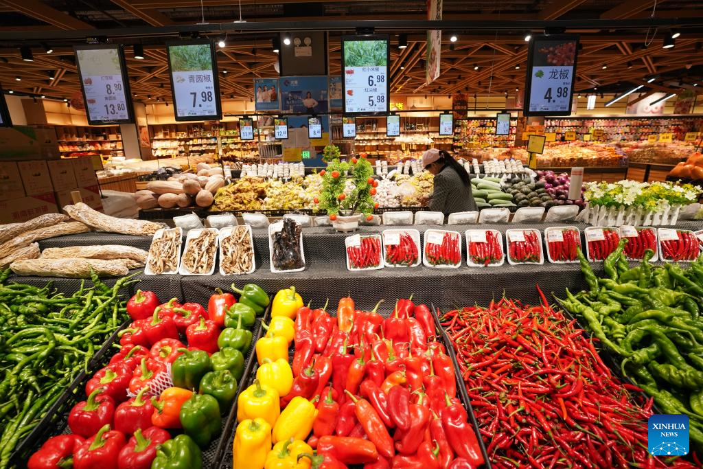 A customer shops for vegetables at a supermarket in Duyun City, southwest China's Guizhou Province, Oct. 13, 2023. China's consumer price index (CPI), a main gauge of inflation, remained unchanged in September compared with a year earlier, the National Bureau of Statistics (NBS) said Friday. On a monthly basis, the CPI rose 0.2 percent from the previous month, according to the NBS. (Photo by Xiao Wei/Xinhua)