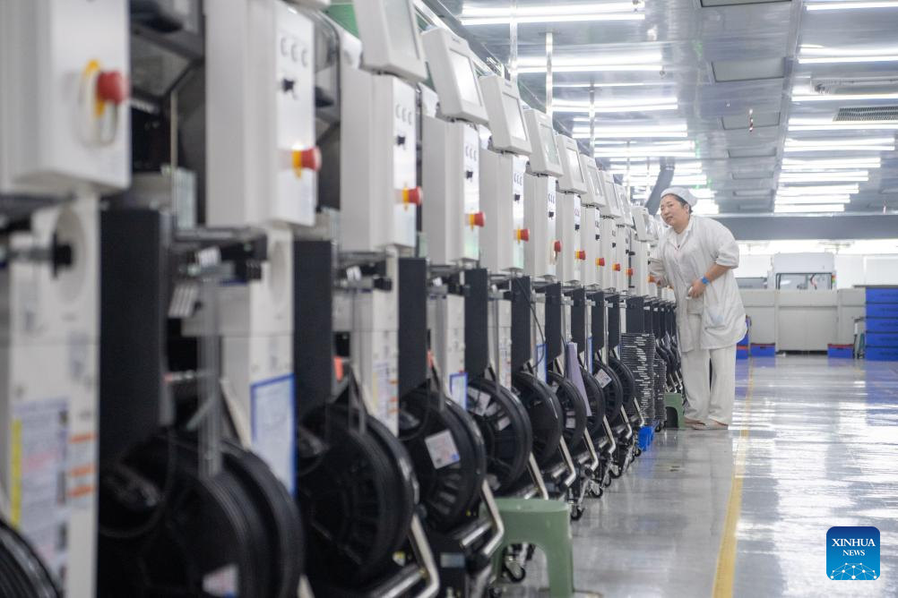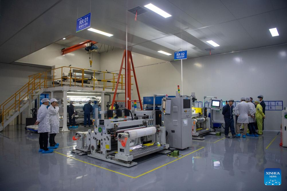 Staff members work on the production line of a new material company in Qijiang District, southwest China's Chongqing Municipality, Oct. 12, 2023. Qijiang District of Chongqing was once an industrial base and a major gear manufacturing city in western China. In recent years, the local government has focused on building an innovation ecosystem that revolves around key elements such as production, human resources, and urban development. This effort has led to a gradual transformation of the district from a resource-based city to a more diversified economy. (Xinhua/Tang Yi)