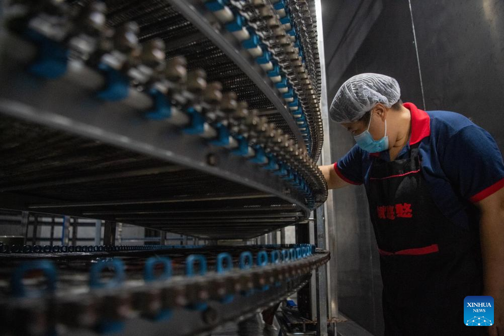 A staff member works on the production line of a food company in an industrial park of Qijiang District, southwest China's Chongqing Municipality, Oct. 11, 2023. Qijiang District of Chongqing was once an industrial base and a major gear manufacturing city in western China. In recent years, the local government has focused on building an innovation ecosystem that revolves around key elements such as production, human resources, and urban development. This effort has led to a gradual transformation of the district from a resource-based city to a more diversified economy. (Xinhua/Tang Yi)