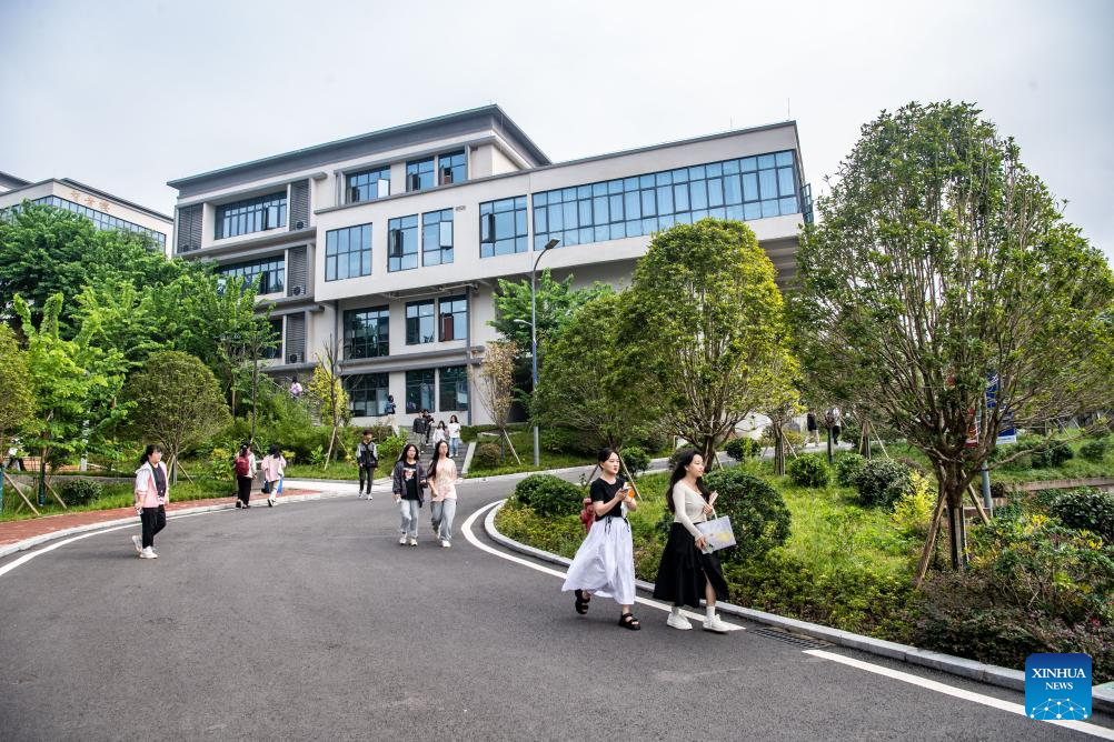 Students are seen on the Qijiang campus of Chongqing College of Mobile Communication in Qijiang District, southwest China's Chongqing Municipality, Sept. 27, 2023. Qijiang District of Chongqing was once an industrial base and a major gear manufacturing city in western China. In recent years, the local government has focused on building an innovation ecosystem that revolves around key elements such as production, human resources, and urban development. This effort has led to a gradual transformation of the district from a resource-based city to a more diversified economy. (Xinhua/Tang Yi)