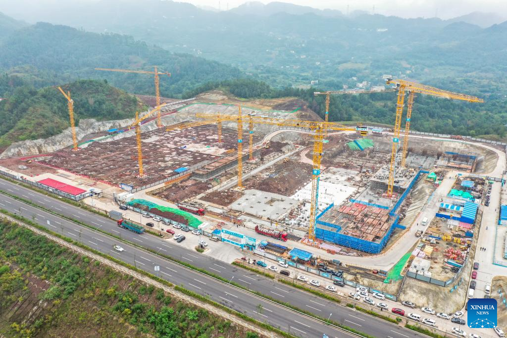 This aerial photo taken on Oct. 12, 2023 shows the construction site of the Chongqing affiliate of Jiangsu Provincial Hospital in Qijiang District, southwest China's Chongqing Municipality. Qijiang District of Chongqing was once an industrial base and a major gear manufacturing city in western China. In recent years, the local government has focused on building an innovation ecosystem that revolves around key elements such as production, human resources, and urban development. This effort has led to a gradual transformation of the district from a resource-based city to a more diversified economy. (Xinhua/Tang Yi)