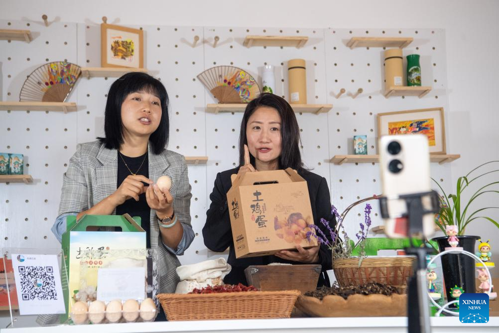 Villagers promote local agricultural products via live streaming in Hongyan Village of Qijiang District, southwest China's Chongqing Municipality, Oct. 12, 2023. Qijiang District of Chongqing was once an industrial base and a major gear manufacturing city in western China. In recent years, the local government has focused on building an innovation ecosystem that revolves around key elements such as production, human resources, and urban development. This effort has led to a gradual transformation of the district from a resource-based city to a more diversified economy. (Xinhua/Tang Yi)