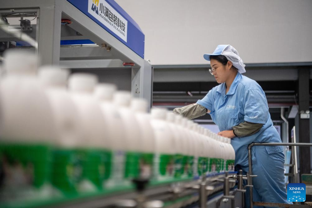 A staff member works on the production line of a beverage company in an industrial park of Qijiang District, southwest China's Chongqing Municipality, Oct. 11, 2023. Qijiang District of Chongqing was once an industrial base and a major gear manufacturing city in western China. In recent years, the local government has focused on building an innovation ecosystem that revolves around key elements such as production, human resources, and urban development. This effort has led to a gradual transformation of the district from a resource-based city to a more diversified economy. (Xinhua/Tang Yi)