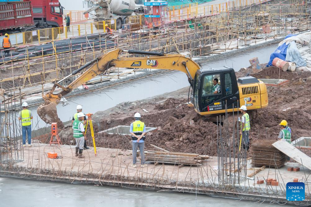 People work at the construction site of the Chongqing affiliate of Jiangsu Provincial Hospital in Qijiang District, southwest China's Chongqing Municipality, Sept. 26, 2023. Qijiang District of Chongqing was once an industrial base and a major gear manufacturing city in western China. In recent years, the local government has focused on building an innovation ecosystem that revolves around key elements such as production, human resources, and urban development. This effort has led to a gradual transformation of the district from a resource-based city to a more diversified economy. (Xinhua/Tang Yi)