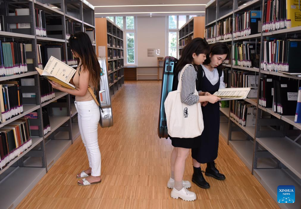 Chinese students Huang Yunyu (R), Huang Yunwen (C) and Wang Jiaxi choose books in a library of the University of Music and Performing Arts Vienna in Vienna, Austria, Sept. 13, 2023.