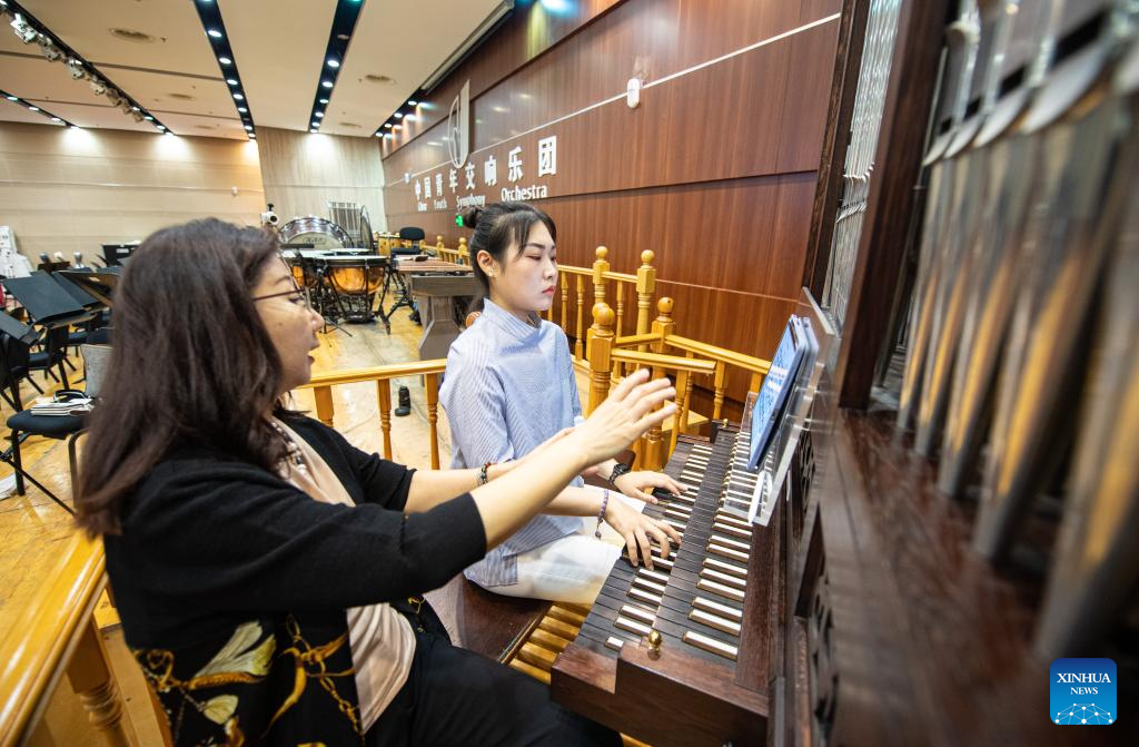 Professor Shen Fanxiu (L) instructs as a student practices "Fantasy in F Minor, K. 608" by Wolfgang Amadeus Mozart on a pipe organ at Central Conservatory of Music in Beijing, China, on Sept. 14, 2023.