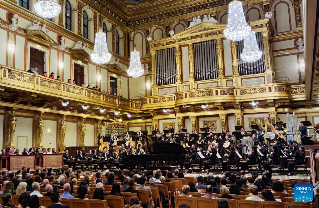 This photo taken on Sept. 24, 2023 shows a Chinese orchestral works concert performed by Suzhou Chinese Orchestra at the Golden Hall of the Wiener Musikverein in Vienna, Austria.