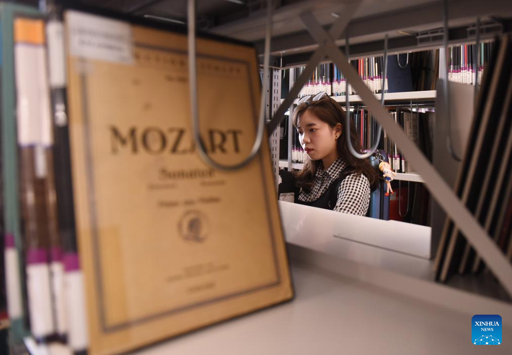 Chinese student Huang Yunwen selects books in a library of the University of Music and Performing Arts Vienna in Vienna, Austria, Sept. 13, 2023.