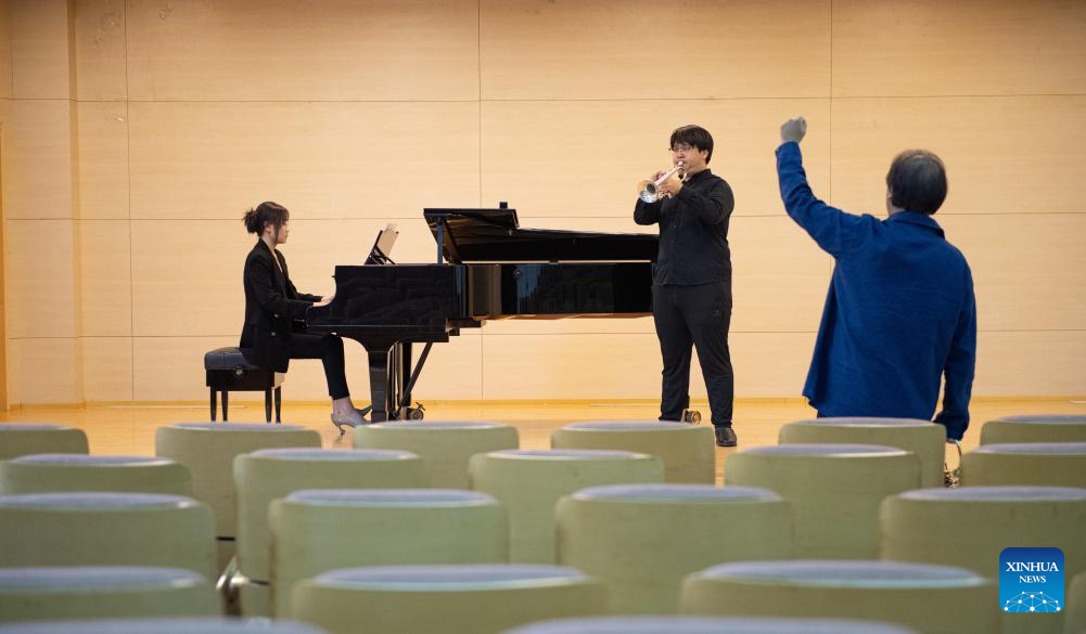 Professor Chen Guang (R) instructs as a student practices "Trumpet Concerto in E-flat Major" by Franz Joseph Haydn at the Central Conservatory of Music in Beijing, China, Sept. 14, 2023.