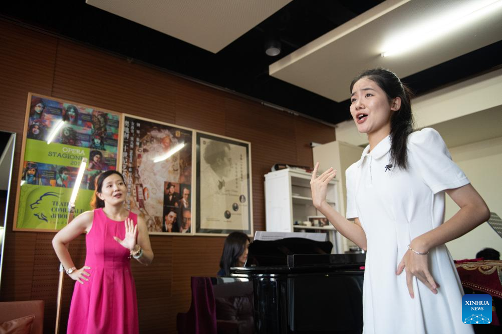 Professor Song Yuanming (L) looks on as a student practices the operetta "Die Fledermaus" by Johann Strauss Jr. at the Central Conservatory of Music in Beijing, China, Sept. 14, 2023.