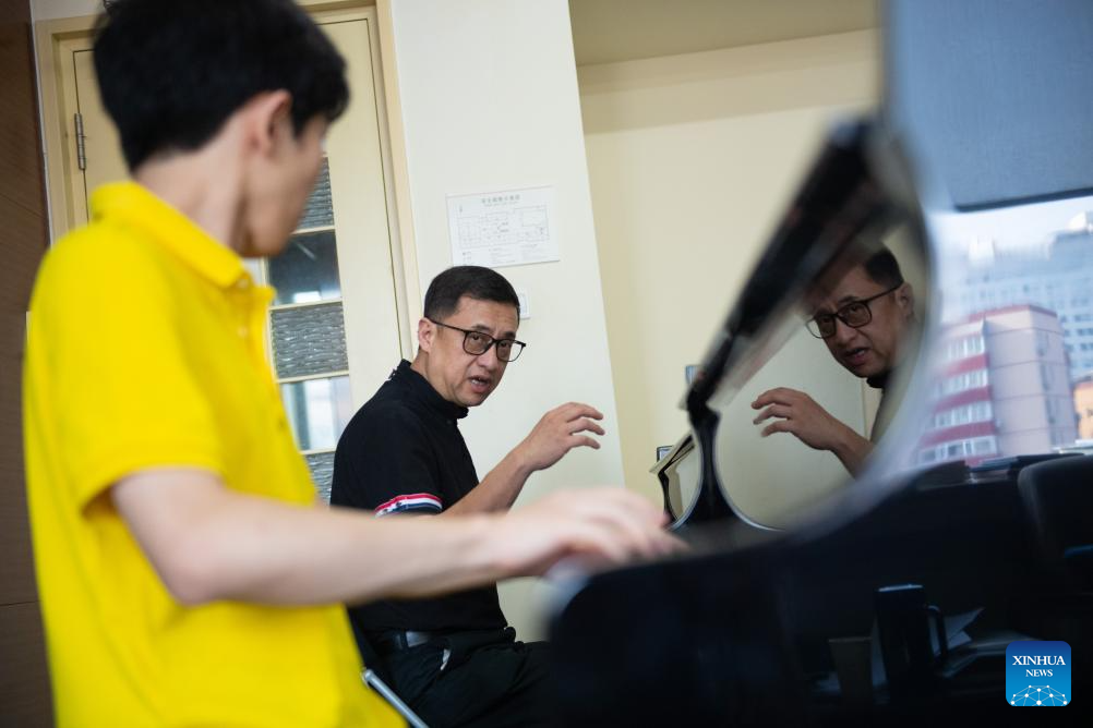 Professor Wei Danwen (back) explains as a student practices "Piano Concerto No. 12 in A major, K. 414" by Wolfgang Amadeus Mozart at the Central Conservatory of Music in Beijing, capital of China, Sept. 14, 2023.