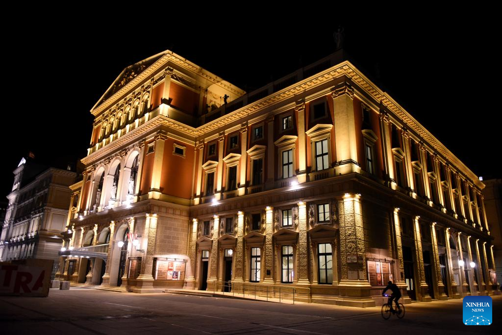 This photo taken on Oct. 5, 2023 shows a night view of the Wiener Musikverein building in Vienna, Austria. The annual Vienna Philharmonic New Year's Concert is held in the Golden Hall located in the building.