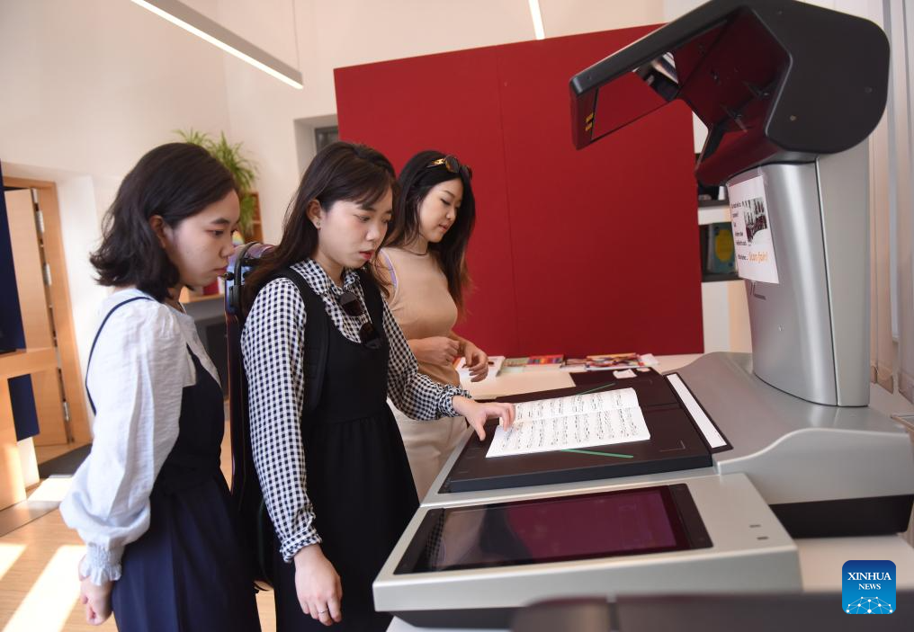 Chinese students Huang Yunyu (L), Huang Yunwen (C) and Wang Jiaxi scan music sheets as academic material at a library of the University of Music and Performing Arts Vienna in Vienna, Austria, Sept. 13, 2023.