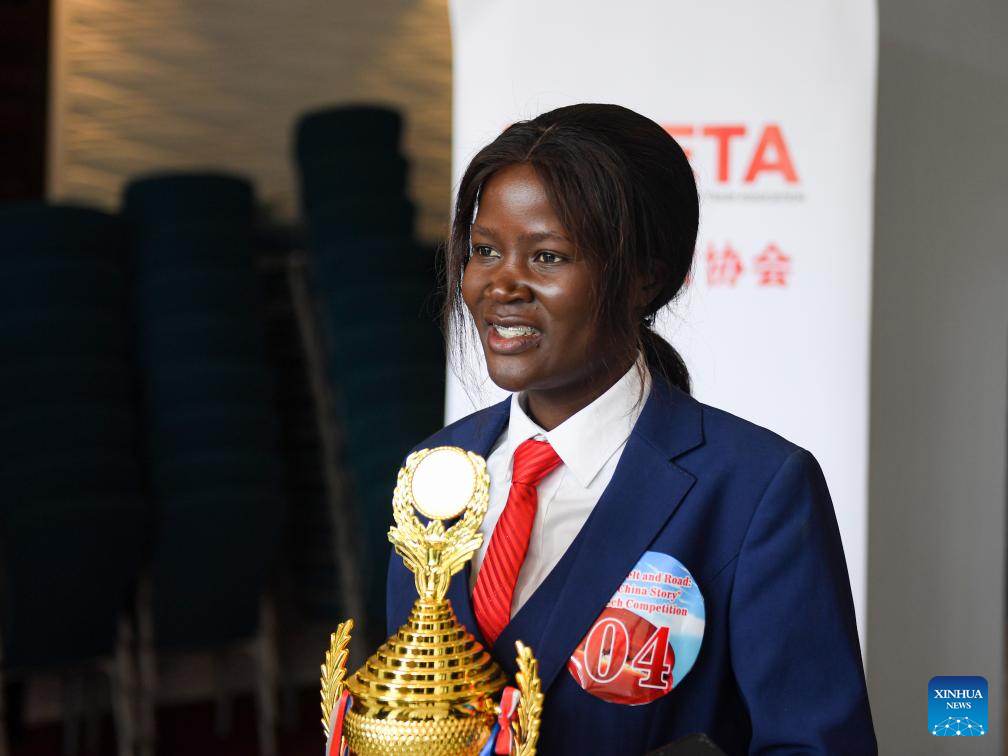 Concilia Owire (C), a female locomotive driver at the Standard Gauge Railway, speaks after taking first place in the Belt and Road "My Chinese Story" Speech Competition in Nairobi, Kenya, on Oct. 13, 2023. Ten employees of Chinese companies based in Kenya were awarded Friday after they emerged winners in the Belt and Road "My Chinese Story" Speech Competition, organized by the Kenya-China Economic and Trade Association. (Xinhua/Li Yahui)