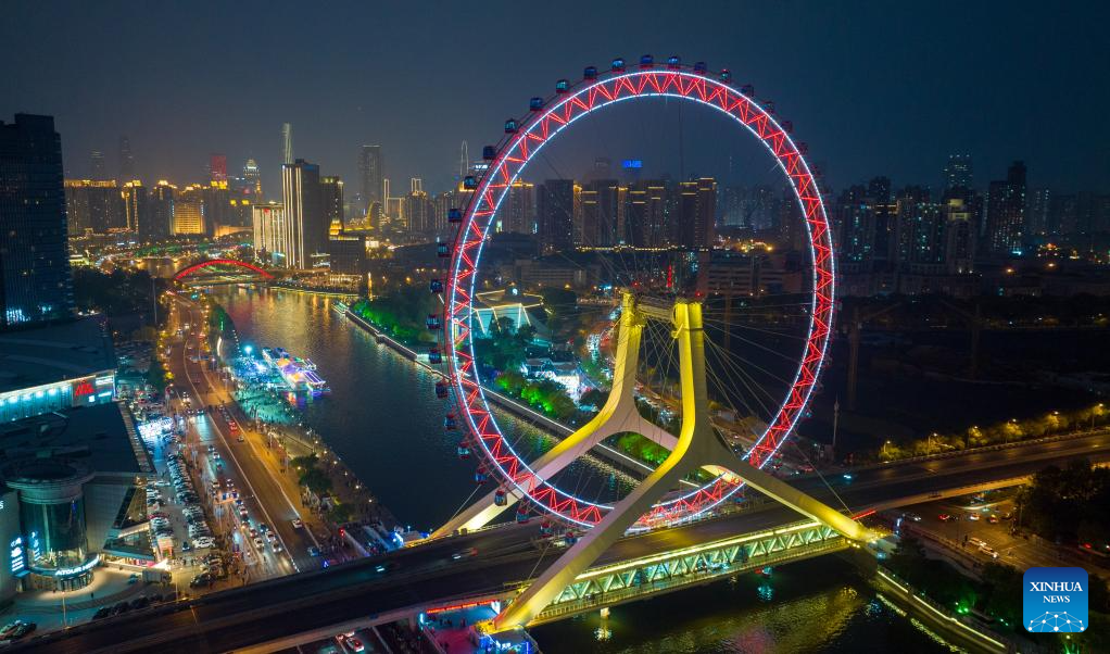 This aerial photo taken on April 27, 2023 shows a night view of "Tianjin Eye" ferris wheel in north China's Tianjin.