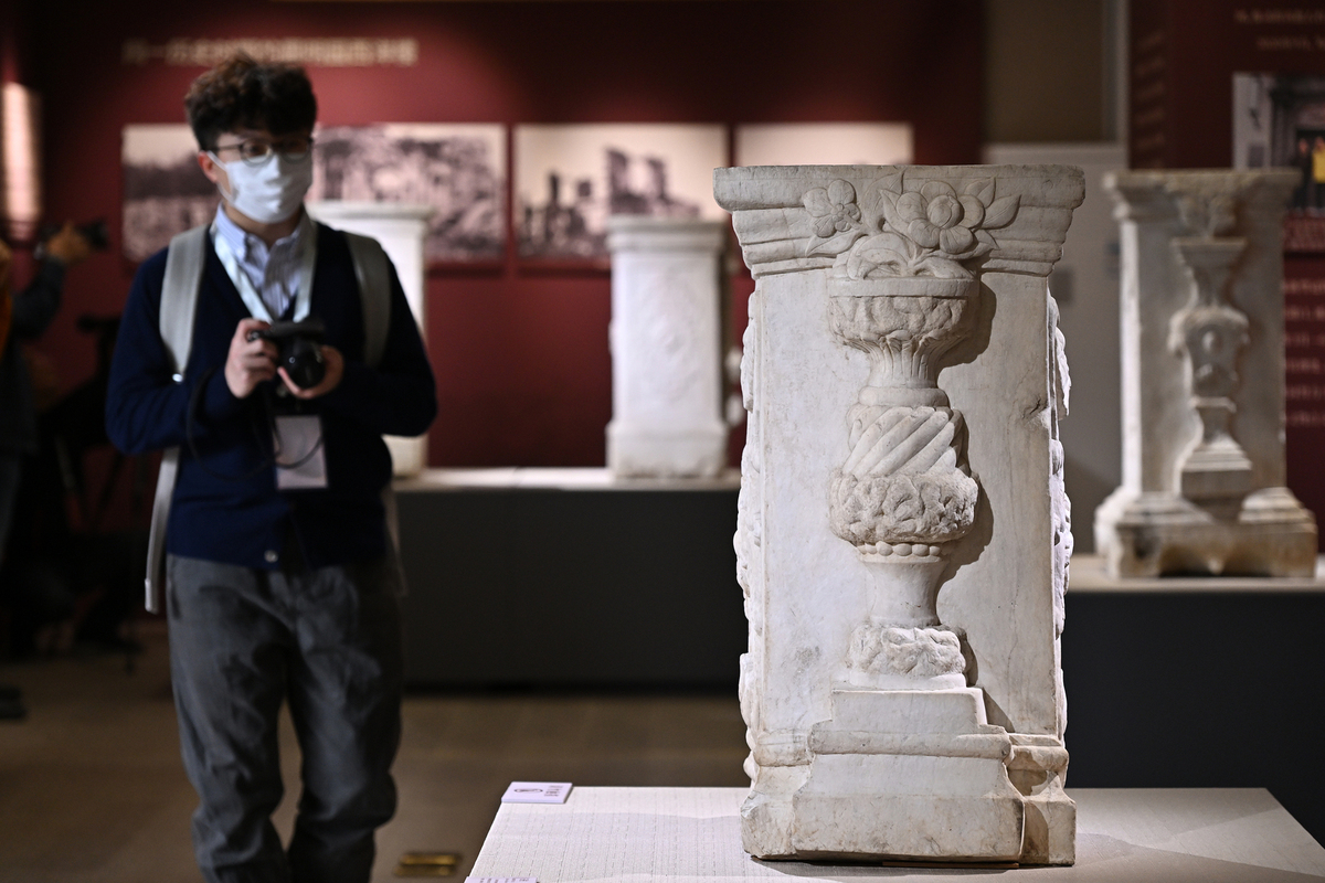 Marble columns from Yuanmingyuan, or the Old Summer Palace, is on display at Zhengjue Temple of Yuanmingyuan Ruins Park in Beijing on Friday. An exhibition displaying all seven marble columns repatriated from Norway opened to the public on Friday. [Photo/Xinhua]