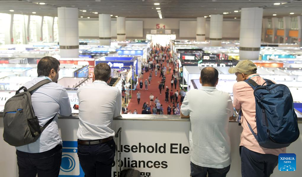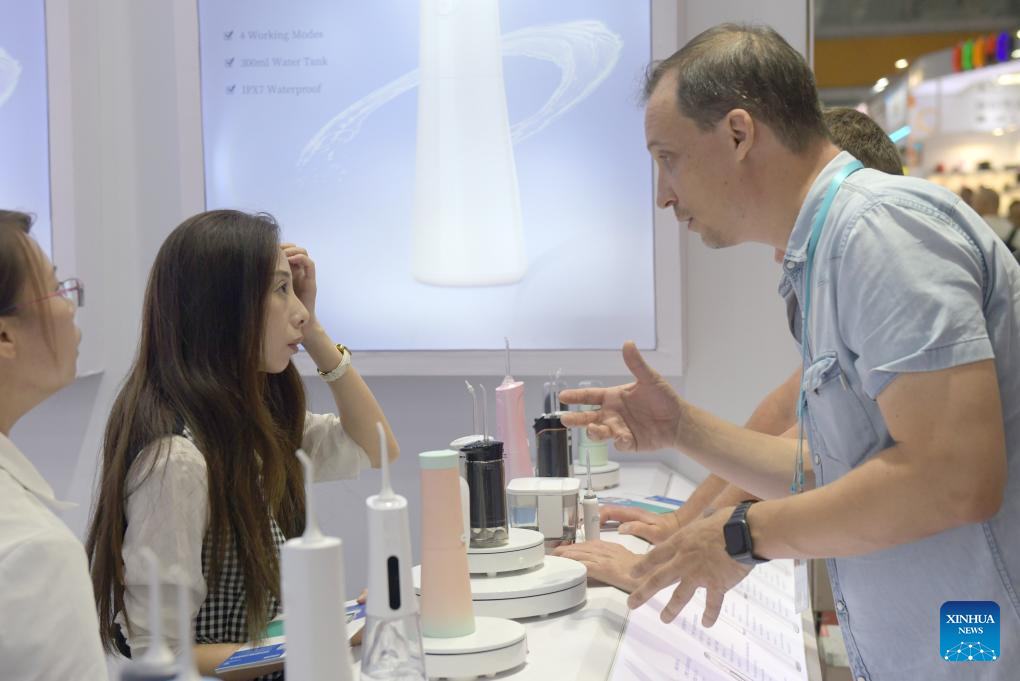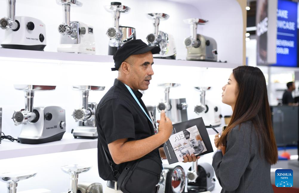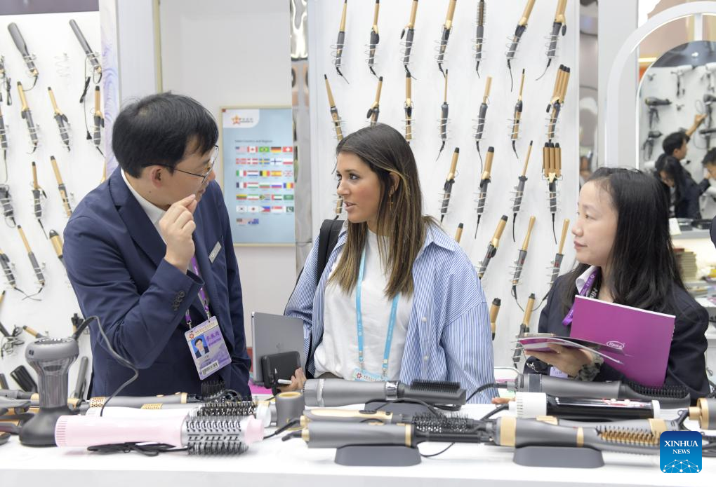 A foreign buyer negotiates business at a booth for small household electrical appliances during the 134th session of the China Import and Export Fair in Guangzhou, south China's Guangdong Province, Oct. 15, 2023.