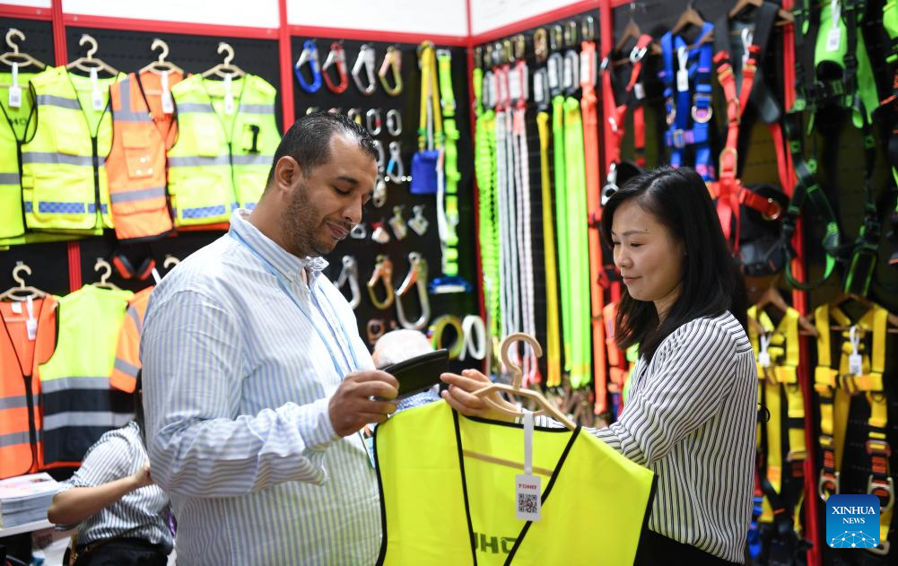 A foreign buyer learns about labour protection appliances at the 134th session of the China Import and Export Fair in Guangzhou, south China's Guangdong Province, Oct. 15, 2023.