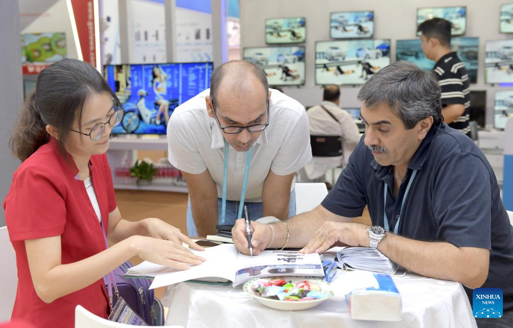 Exhibitors negotiate business at the International Pavilion of the 134th session of the China Import and Export Fair in Guangzhou, south China's Guangdong Province, Oct. 15, 2023.