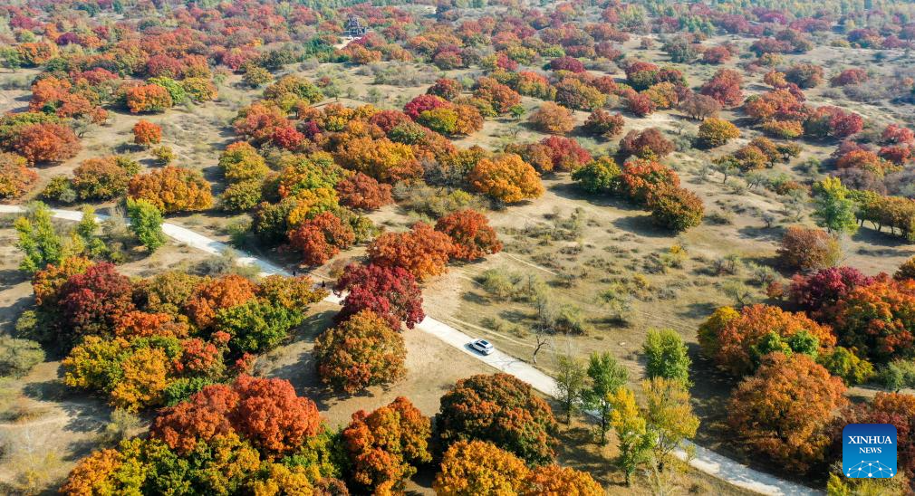This aerial photo taken on Oct. 14, 2023 shows the autumn scenery of a forest park in Horqin Left Wing Rear Banner of Tongliao City, north China's Inner Mongolia Autonomous Region. (Xinhua/Lian Zhen)
