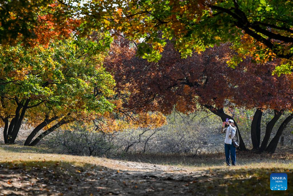 Tourists visit a forest park in Horqin Left Wing Rear Banner of Tongliao City, north China's Inner Mongolia Autonomous Region, Oct. 14, 2023. (Xinhua/Lian Zhen)