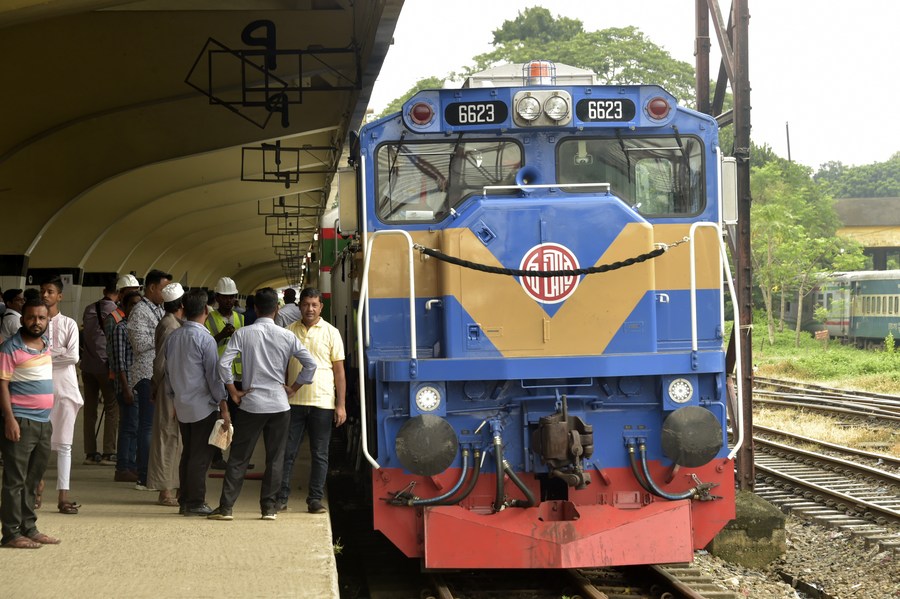 Passengers prepare to board a train during a trial run along the newly-constructed mega Belt and Road Initiative (BRI) rail line via the China-built Bangladesh's largest Padma Bridge on the outskirts of Dhaka, Bangladesh, Sept. 7, 2023. (Xinhua/Salim)